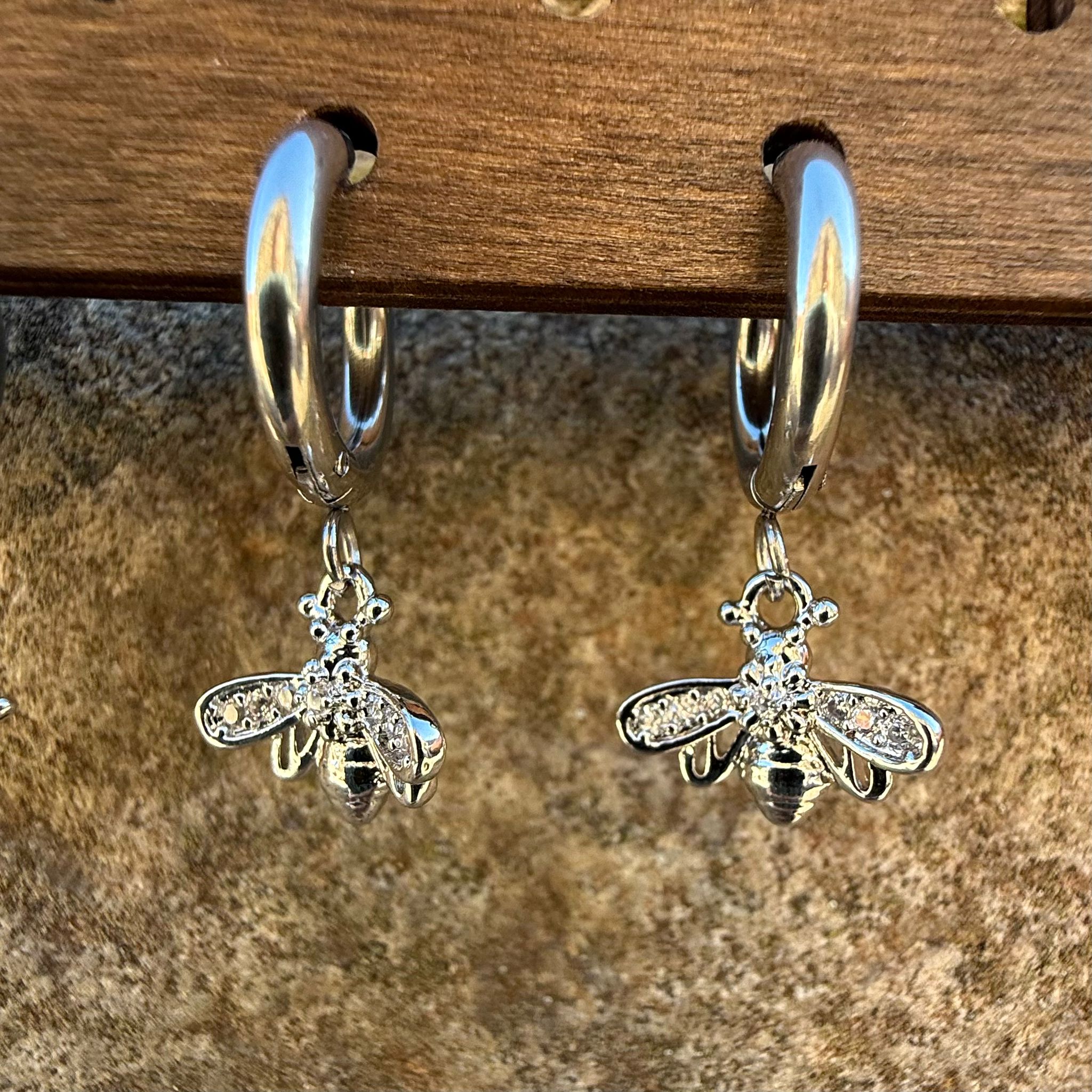 Pendientes aro plateado abeja brillo